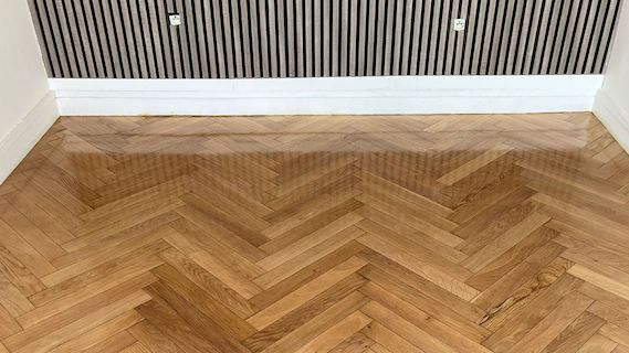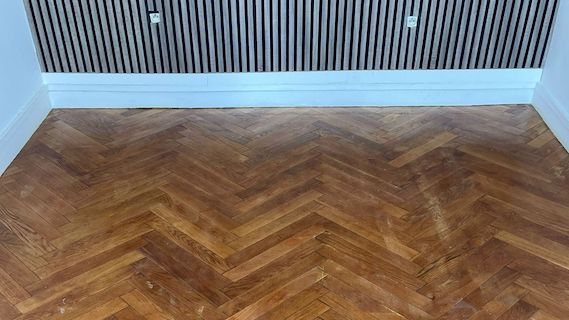 Nous avons ensuite réalisé un ponçage de finition minutieux, particulièrement important sur un parquet bâton rompu cloué. Les changements d’orientation des lames exigent précision et régularité afin de conserver la géométrie du motif. Les angles, les bords et les zones difficiles d’accès ont été traités avec le plus grand soin pour garantir une surface parfaitement lisse et homogène.